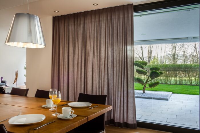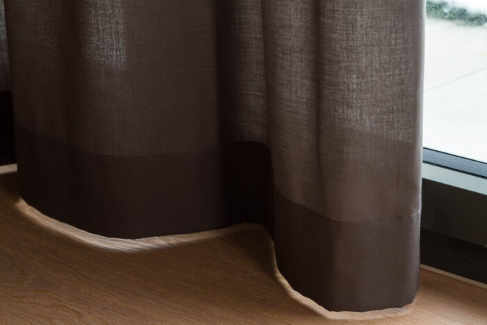 Dieser Stoff kann klassisch mit Einfachfalten wie auf den Bildern zu sehen, aber auch hervorragend mit den trendigen Wellen konfektioniert werden. Der Abschluss unten wird mit einem edel fallenden Saum in 5/10 cm Höhe ausgeführt.